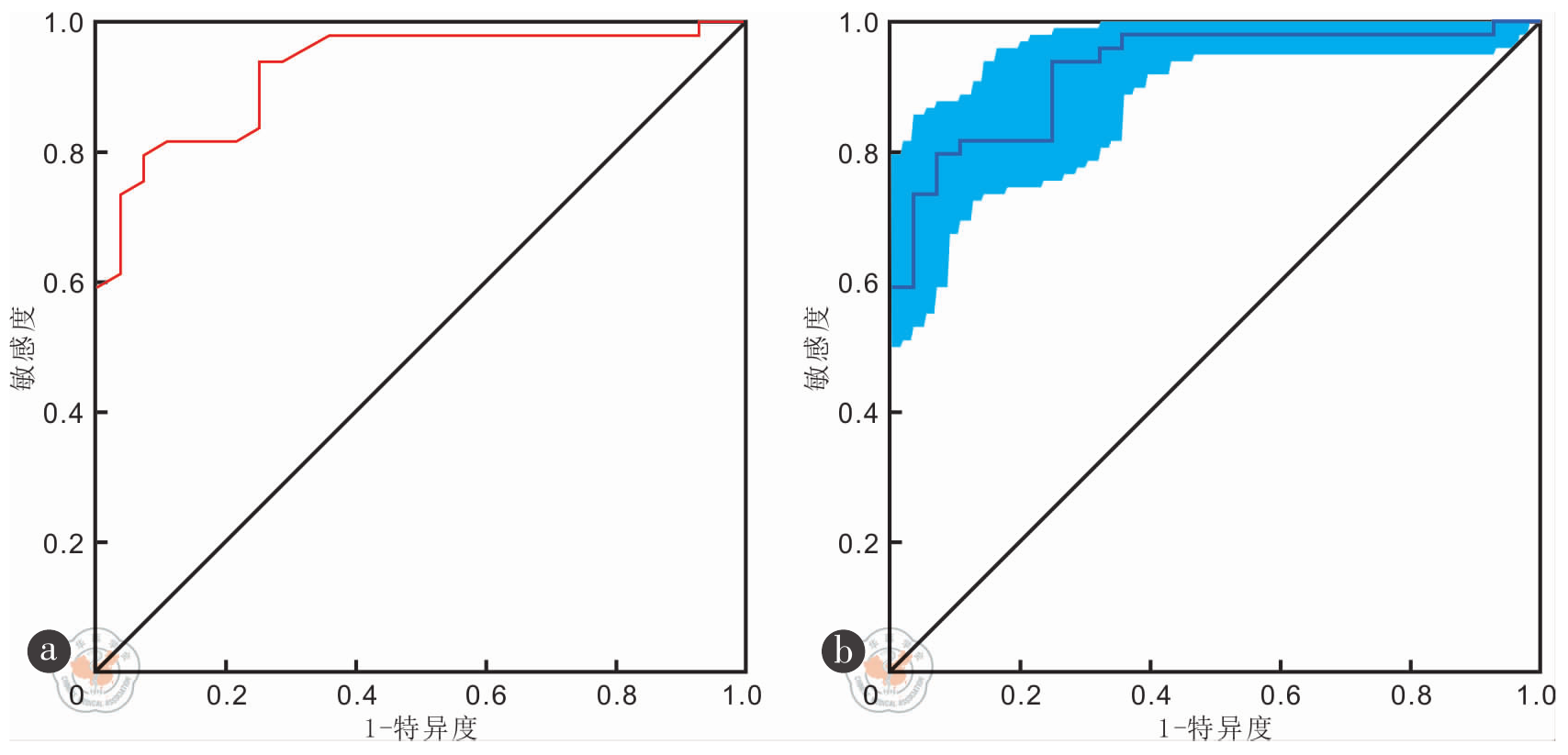 图2 列线图模型预测SAE患儿ICP增高效能的ROC曲线注:a图为原始模型;b图为Bootstrap内部验证模型;SAE.脓毒症相关性脑病;ICP.颅内压;ROC.受试者工作特征