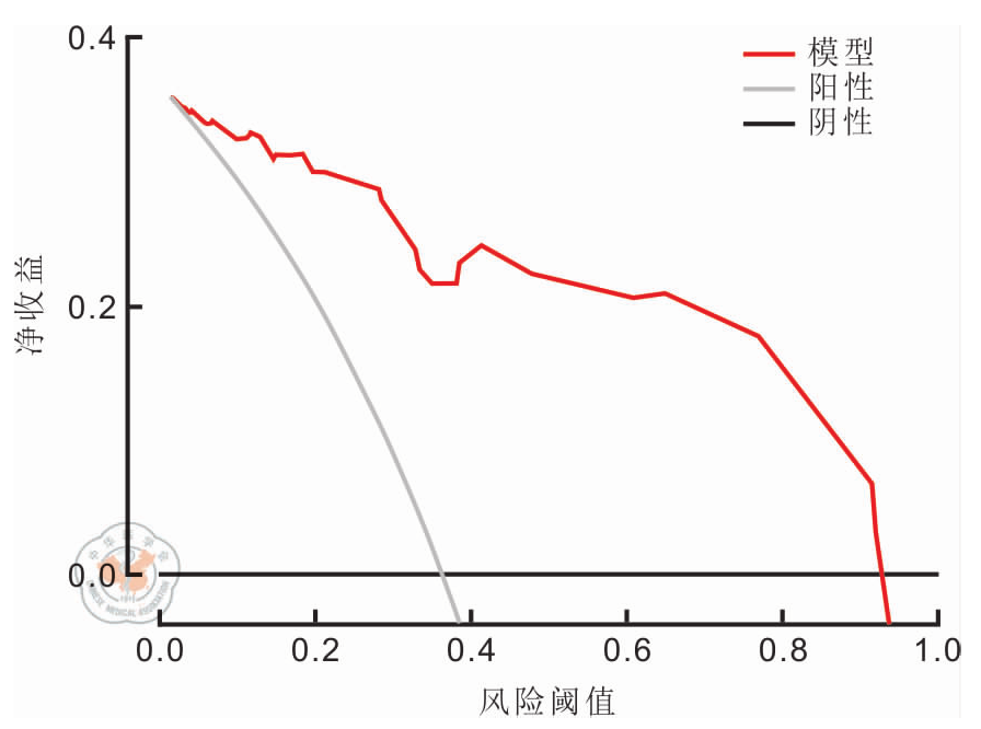 图4 SAE患儿ICP增高风险预测列线图的DCA注:SAE.脓毒症相关性脑病;ICP.颅内压;DCA.决策曲线分析;阳性为对所有SAE患者实施干预的DCA;阴性为不对任何SAE患者实施干预的DCA;模型为基于列线图模型选择干预的DCA