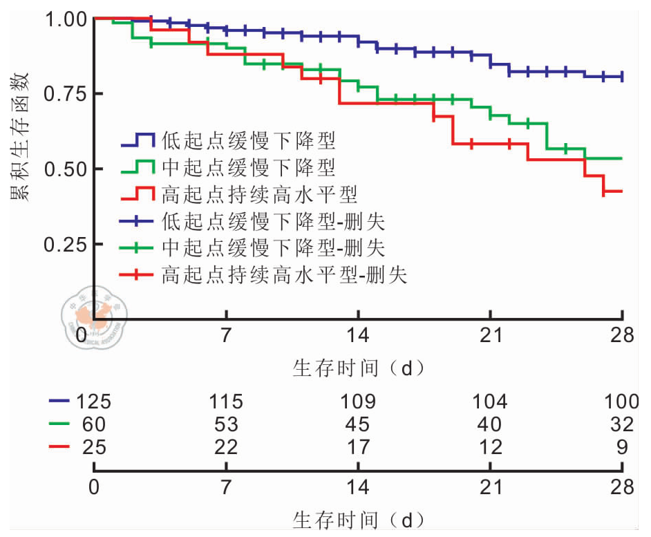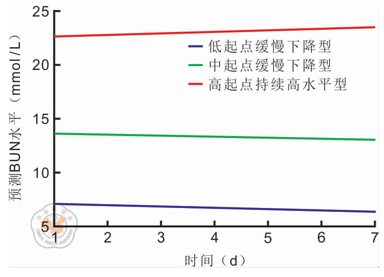 A total of 210 patients diagnosed with sepsis were included in this study. Based on the longitudinal trajectories of BUN, three distinct trajectory patterns were identified: a low-initial slow-decline trajectory, a high-initial persistently high-level trajectory, and a moderate-initial slow-decline trajectory. The corresponding 28-day all-cause mortality rates for these trajectories were 20.0% (25/125), 64.0% (16/25), and 46.7% (28/60), respectively. Kaplan-Meier survival analysis demonstrated clear separation of the 28-day survival curves among the three groups, with a statistically significant difference observed between groups (log-rank χ2 = 20.030, P < 0.001). In comparison to the low-initial slow-decline trajectory, patients in both the high-initial persistently high-level trajectory and the moderate-initial slow-decline trajectory demonstrated significantly lower overall survival probabilities; notably, the high-initial persistently high-level group exhibited the lowest 28-day survival rate, indicating the poorest 28-day prognosis (all P < 0.001). Cox regression analysis showed that, using the low-initial slow-decline trajectory as the reference, patients classified in the high-initial persistently high-level trajectory [hazard ratio (HR) = 2.500, 95% confidence interval (CI) (1.200, 5.400), P = 0.020] and those in the moderate-initial slow-decline trajectory [HR = 2.600, 95%CI (1.400, 4.700), P = 0.002] exhibited a significantly increased risk of 28-day all-cause mortality.
